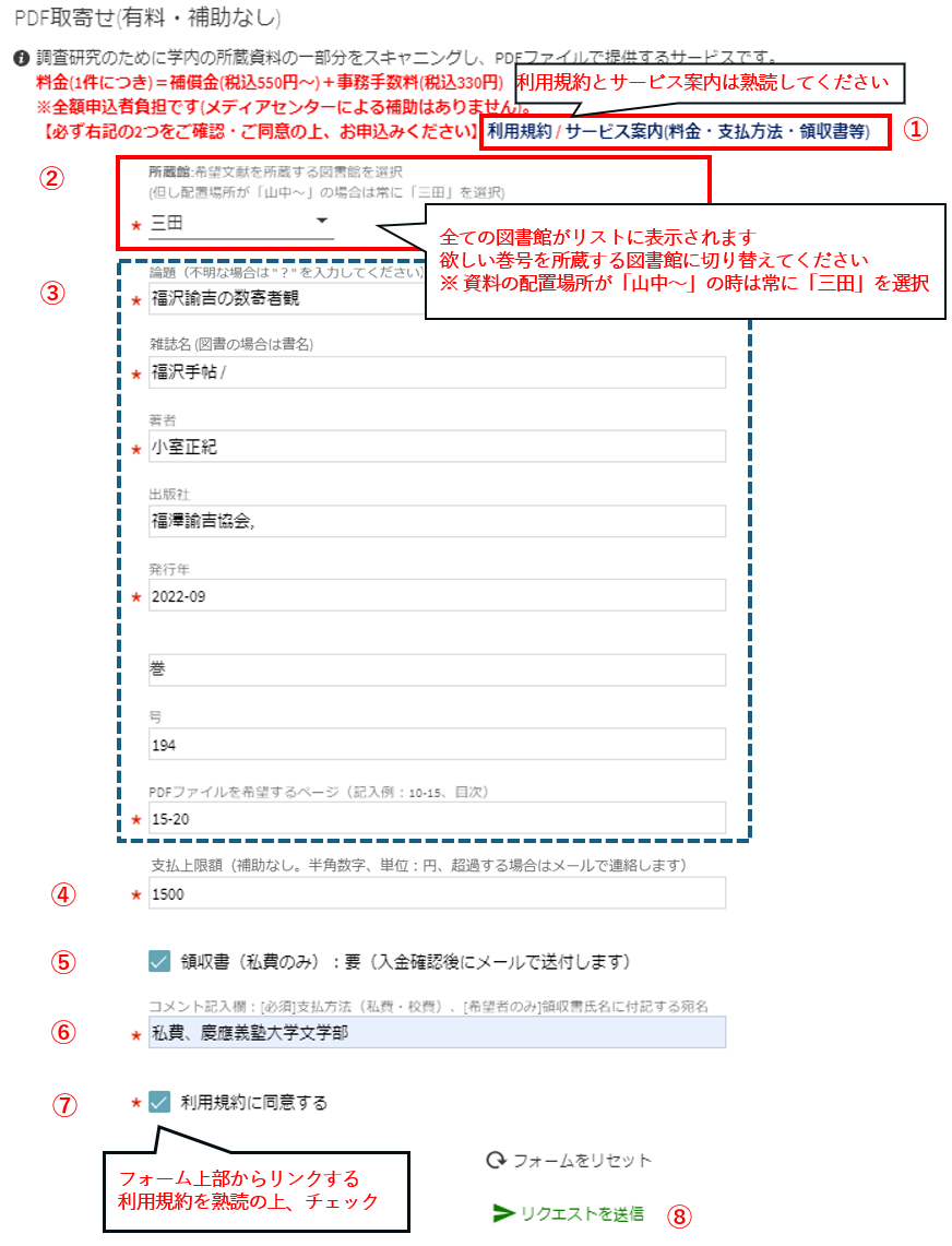 | ⑤領収書 | 私費払いで領収書が必要な場合にのみチェックしてください。領収書には図書館システムに登録されている氏名を印字します。それ以外の宛名(組織名等)が必要な場合はコメント欄にご記入ください(例:慶應義塾大学〇〇学部)。慶應義塾以外の組織名で発行はできません。 |