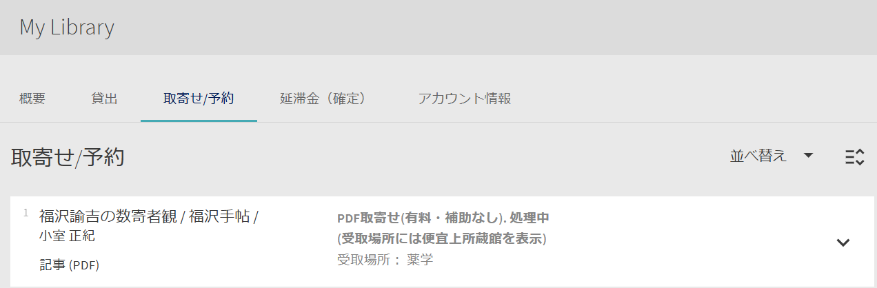 申込状況は、My Libraryの「取寄せ/予約」で確認できます。