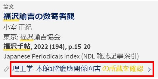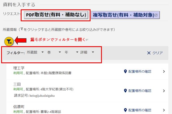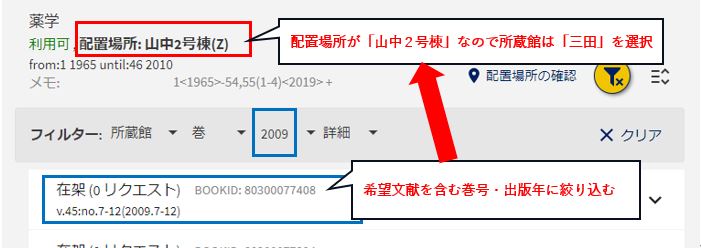 全てのキャンパスがリストに表示されます。欲しい巻号を所蔵しているキャンパスに切り替えてください。 但し、配置場所が「山中1号棟」「山中2号棟」の場合、所蔵館は常に「三田」を選択してください。 ※所蔵していないキャンパスを指定して申込されても、その申込はキャンセルとなります。 |