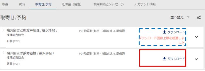 14日以内にMy Libraryの「取寄せ/予約」でダウンロードしてください。メールでの通知後14日間経過した申込は、取寄せ/予約タブに表示されなくなります。ダウンロード上限は3回までです。