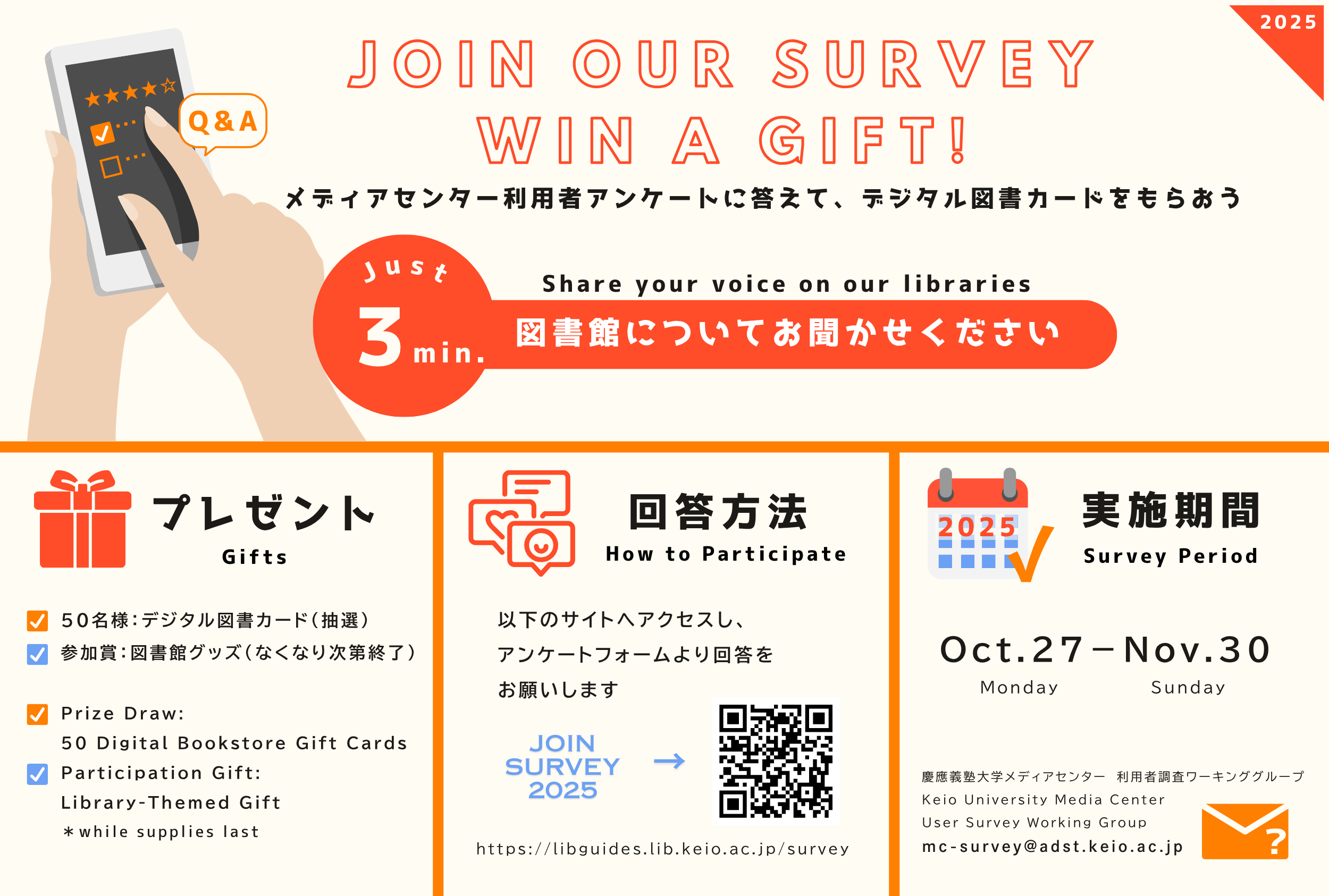 抽選で50名に1,000円分のデジタル図書カードをお贈りします(学生の方のみ対象)。応募される方は、アンケート最終項目でkeio.jpのメールアドレスをご入力ください。